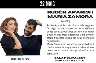 Rubén Aparisi is very direct and sometimes he makes magic. His obsession to defend everyday things puts him in a unique space with his refreshing and personal sense of humor. Maria Zamora is a Valencian actress, presenter and comedian who shows off her talent for humor and comical improvisation in every show.
